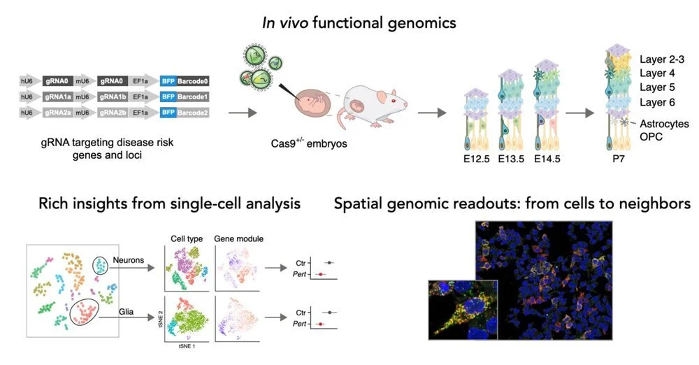 To tackle these questions, we combine in vivo CRISPR screening with single-cell multi-omics, spatial genomics, and chemical biology tools. Our work is deeply collaborative—both within our lab and across disciplines—and bridges cutting-edge neurotechnology with fundamental questions in brain development. This integration of tool-building and mechanistic insight positions us to uncover how diverse inputs shape the brain’s trajectory in health and disease.